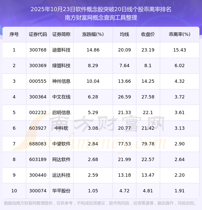 2025年10月23日軟件概念股突破20日線個股乖離率排名