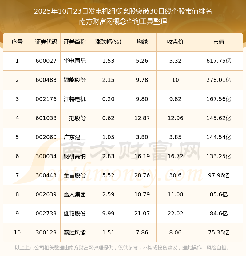 2025年10月23日發(fā)電機組概念股突破30日線個股市值排名