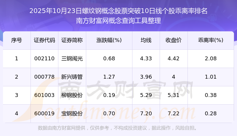 根據(jù)南方財富網(wǎng)概念查詢工具數(shù)據(jù)統(tǒng)計,截止2025年10月23日收盤,螺紋鋼概念股票共有4只個股收盤價向上突破了10日線。其中乖離率較大的個股有三鋼閩光、新興鑄管、柳鋼股份等,乖離率分別為2.08%、1.01%、0.38%。
