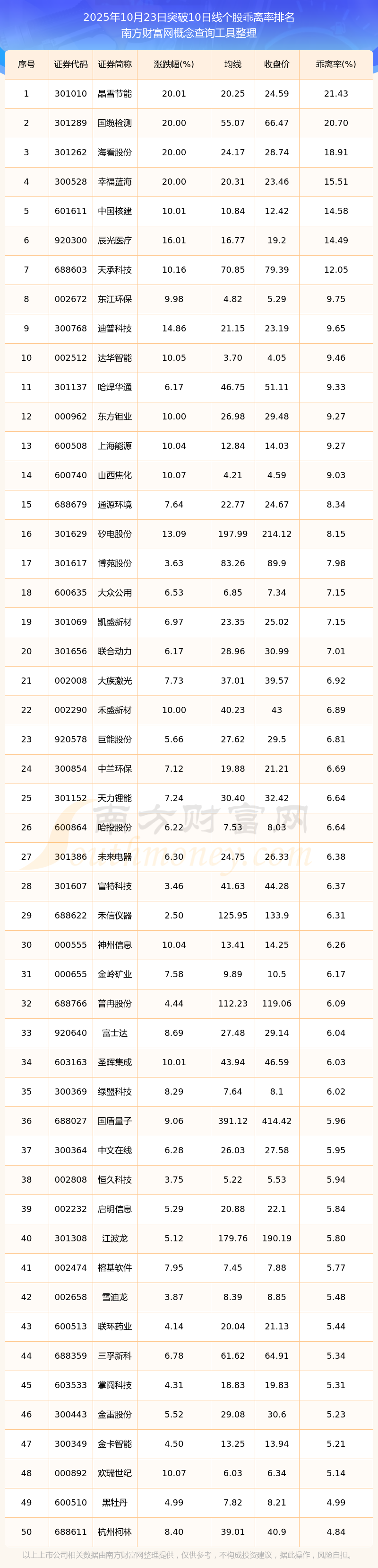 2025年10月23日突破10日線個股乖離率排名
