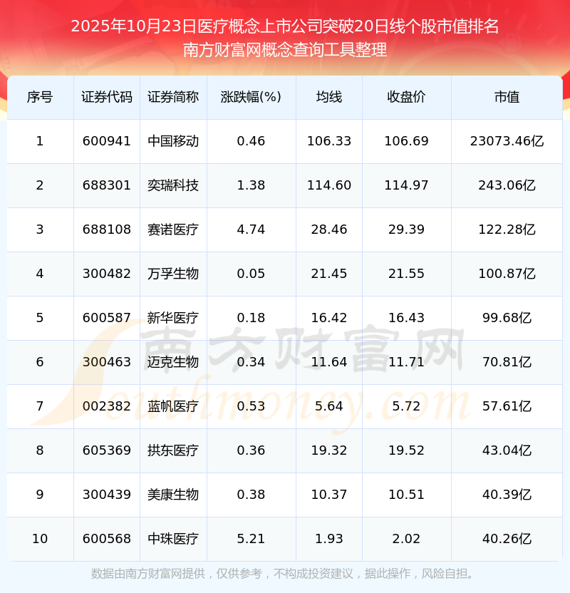 2025年10月23日醫(yī)療概念上市公司突破20日線個(gè)股市值排名