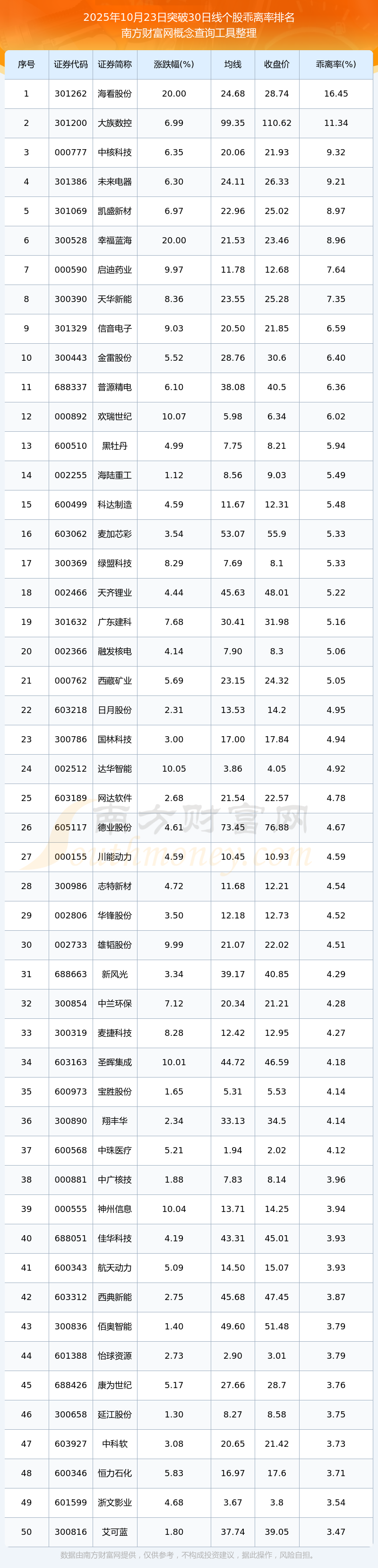 2025年10月23日突破30日線個(gè)股乖離率排名
