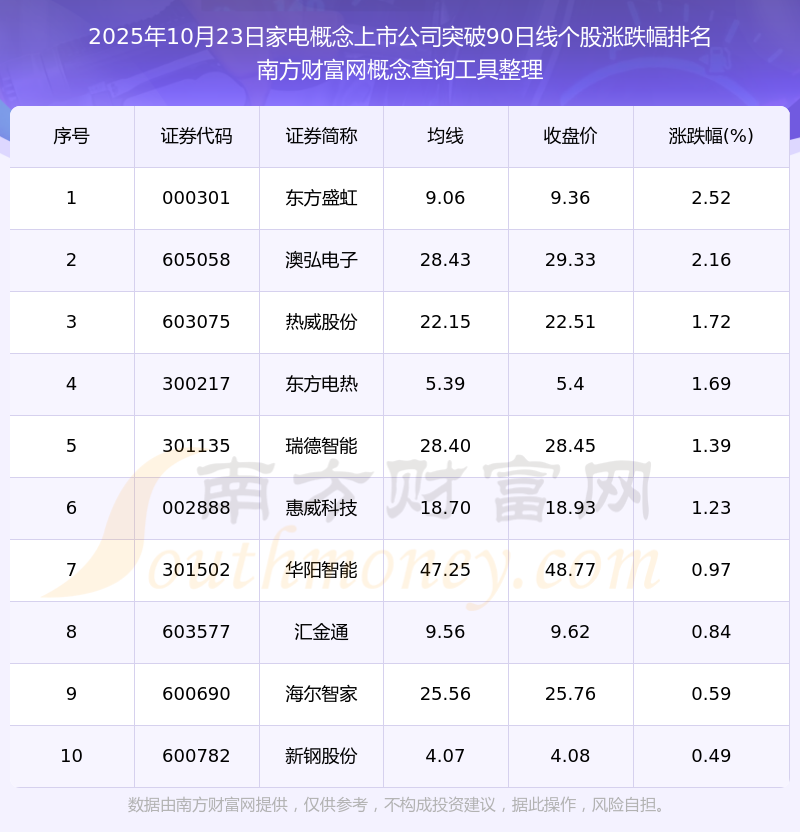 2025年10月23日家電概念上市公司突破90日線個(gè)股漲跌幅排名