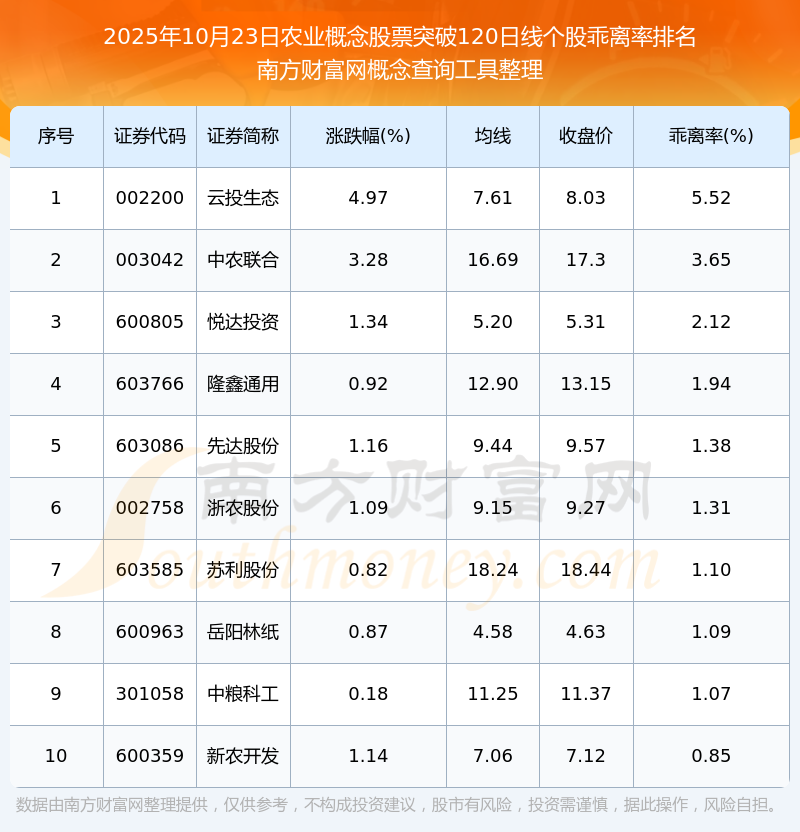 2025年10月23日農(nóng)業(yè)概念股票突破120日線個(gè)股乖離率排名