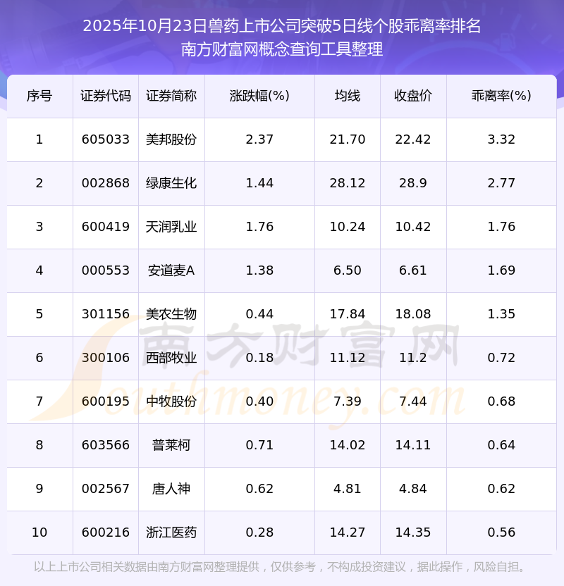 2025年10月23日獸藥上市公司突破5日線個股乖離率排名