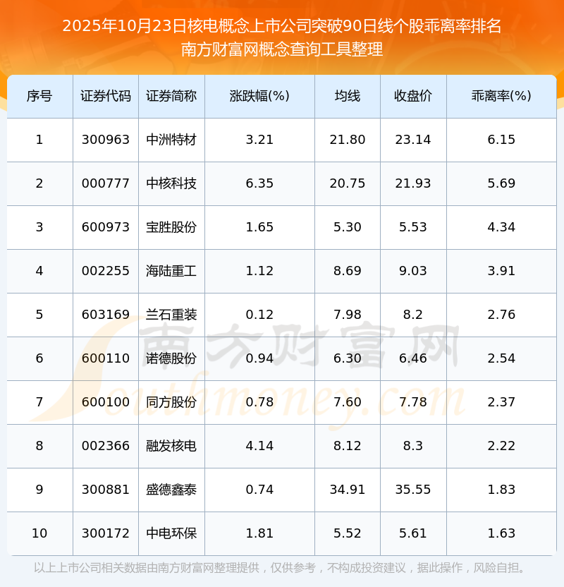 2025年10月23日核電概念上市公司突破90日線個股乖離率排名