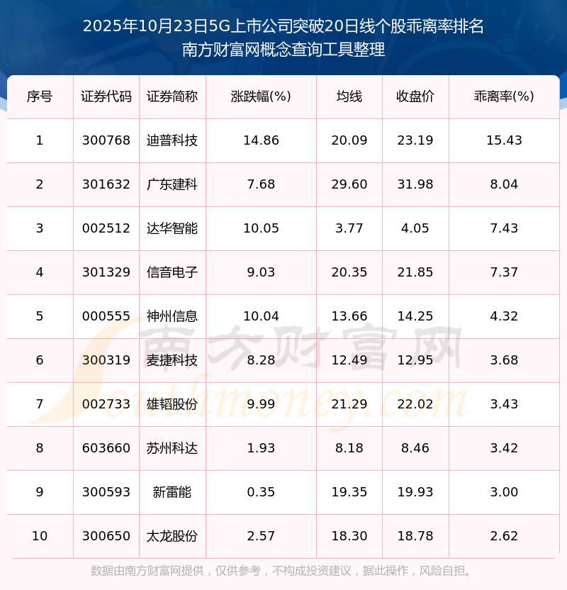 2025年10月23日5G上市公司突破20日線個股乖離率排名
