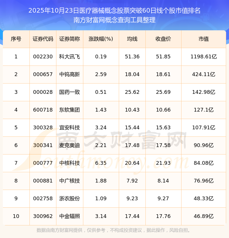 2025年10月23日醫(yī)療器械概念股票突破60日線個股市值排名