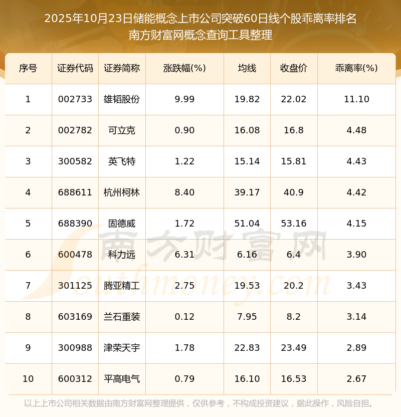 2025年10月23日儲(chǔ)能概念上市公司突破60日線個(gè)股乖離率排名