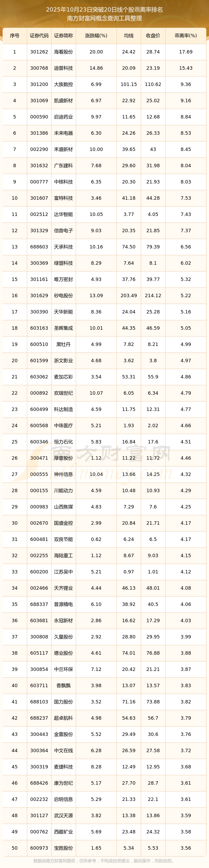 2025年10月23日突破20日線個(gè)股乖離率排名