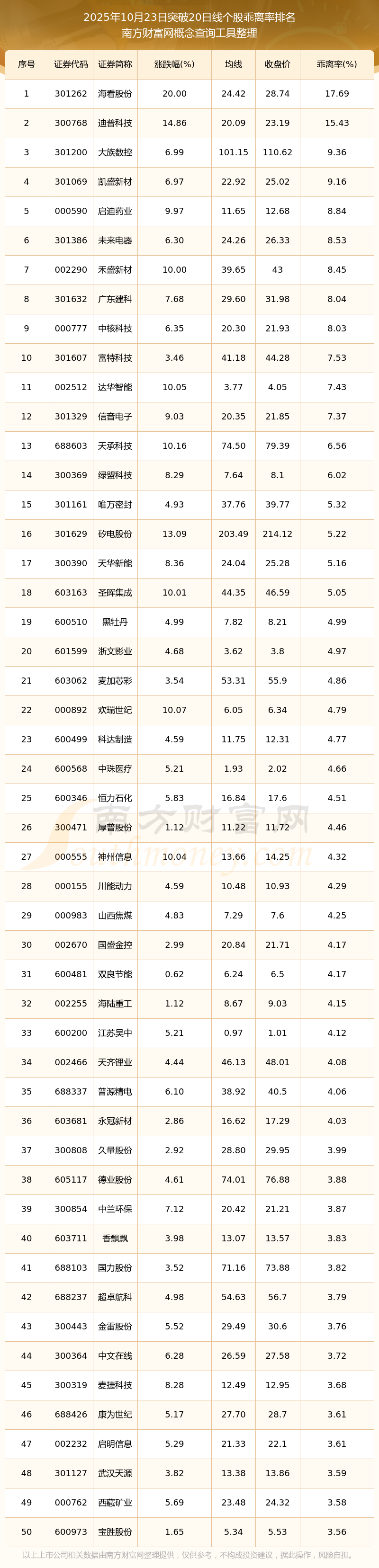 根據(jù)南方財富網(wǎng)概念查詢工具數(shù)據(jù)統(tǒng)計,截止2025年10月23日收盤,共有567只個股收盤價向上突破了20日線,其中乖離率較大的個股有?垂煞荨⒌掀湛萍、大族數(shù)控、凱盛新材、啟迪藥業(yè)等,乖離率分別為17.69%、15.43%、9.36%、9.16%、8.84%。