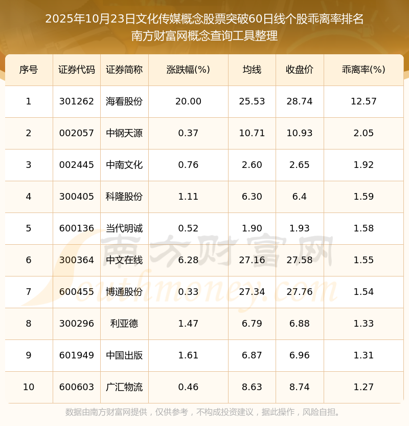 2025年10月23日文化傳媒概念股票突破60日線個股乖離率排名
