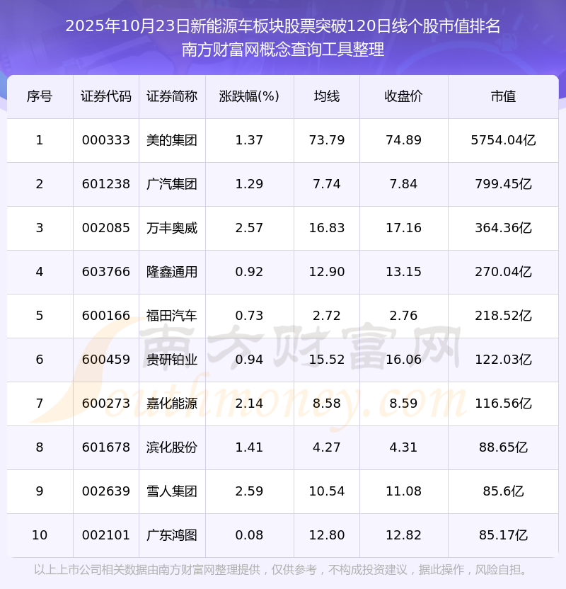 2025年10月23日新能源車板塊股票突破120日線個(gè)股市值排名