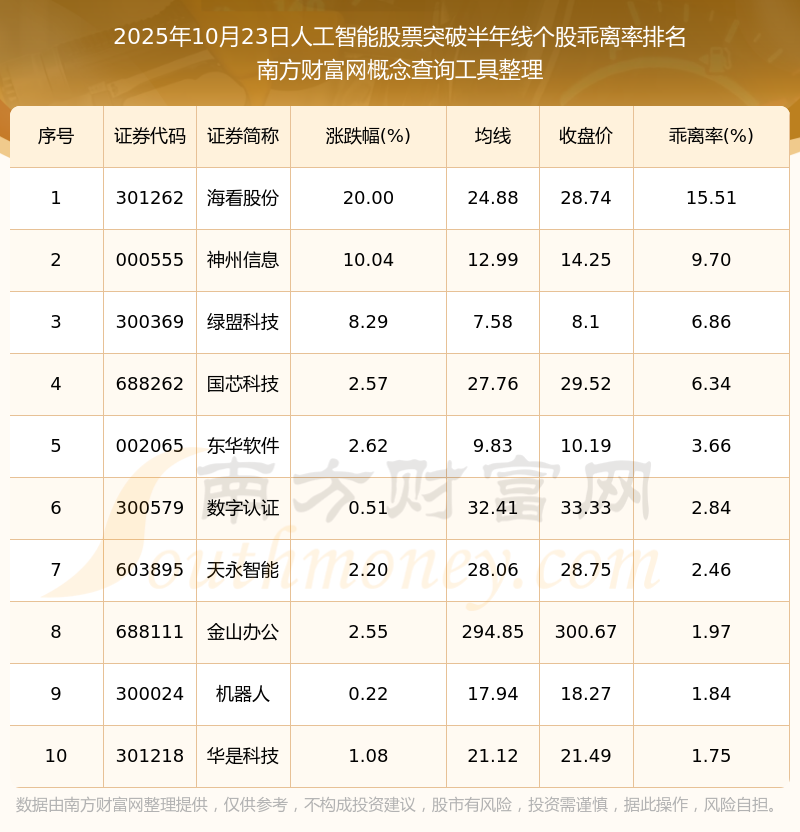 2025年10月23日人工智能股票突破半年線個(gè)股乖離率排名