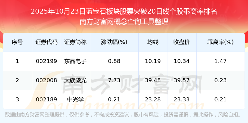 2025年10月23日藍(lán)寶石板塊股票突破20日線個(gè)股乖離率排名