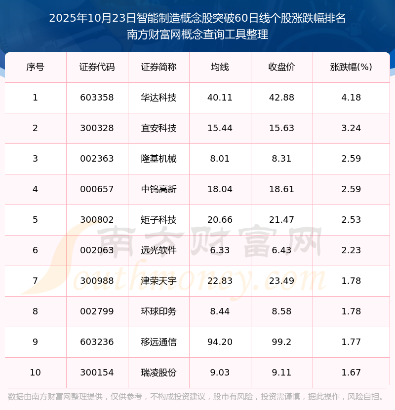 2025年10月23日智能制造概念股突破60日線個(gè)股漲跌幅排名