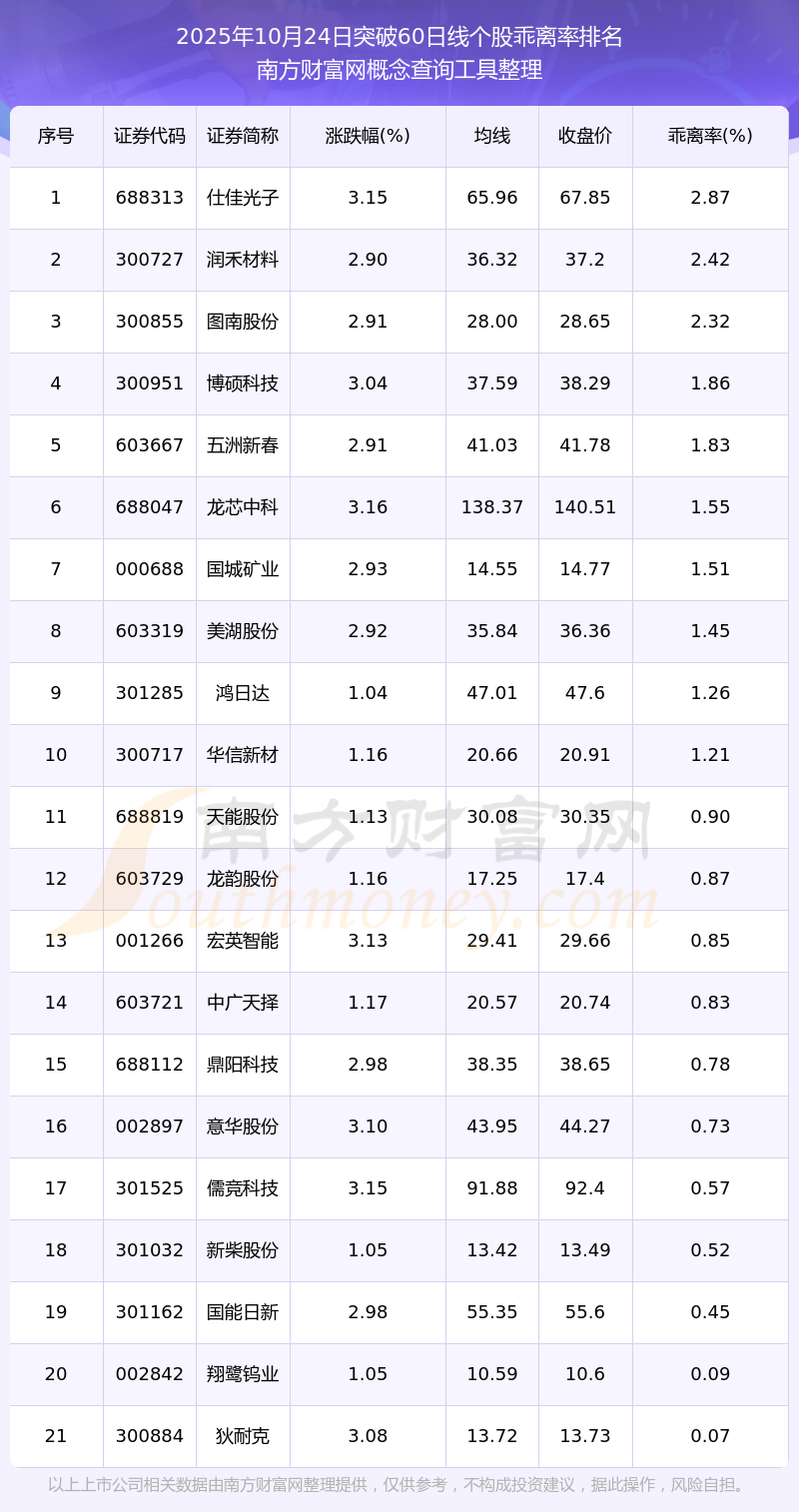 根據南方財富網概念查詢工具數據統(tǒng)計,截止2025年10月24日收盤,共有21只個股收盤價向上突破了60日線,其中乖離率較大的個股有仕佳光子、潤禾材料、圖南股份、博碩科技、五洲新春等,乖離率分別為2.87%、2.42%、2.32%、1.86%、1.83%。
