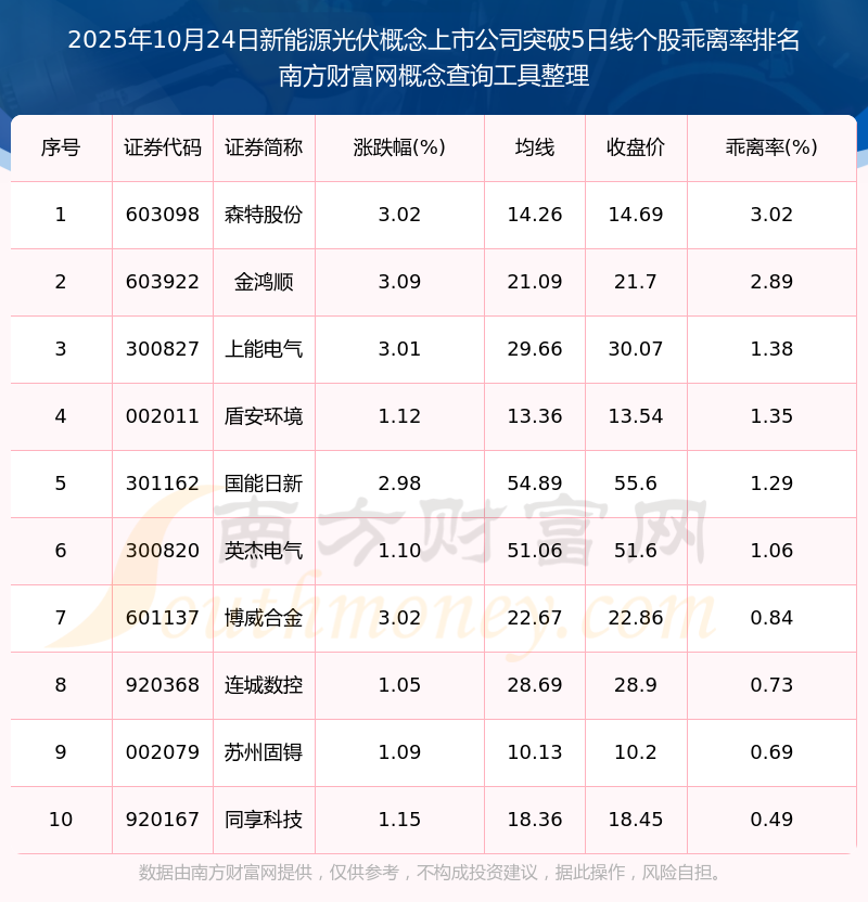 2025年10月24日新能源光伏概念上市公司突破5日線個(gè)股乖離率排名