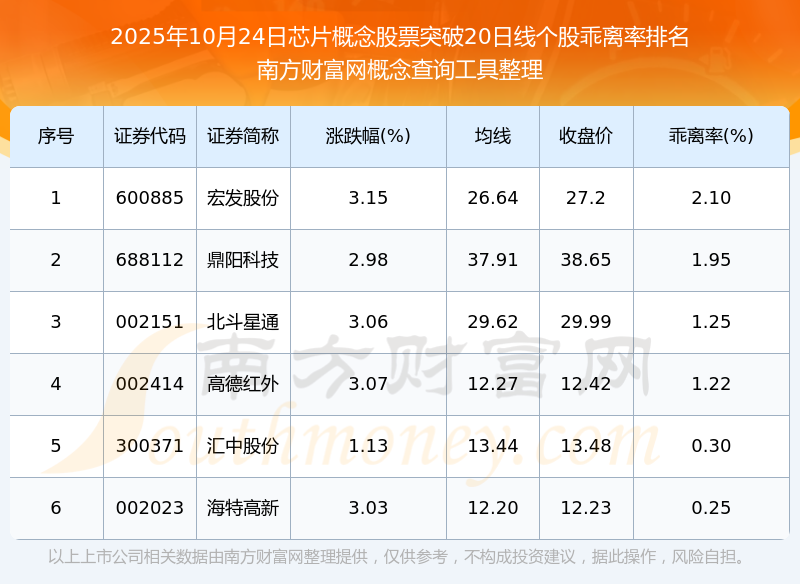 2025年10月24日芯片概念股票突破20日線個(gè)股乖離率排名