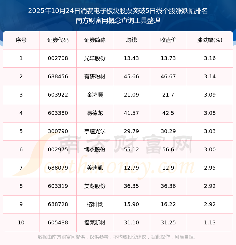 根據(jù)南方財富網(wǎng)概念查詢工具數(shù)據(jù)統(tǒng)計,截止2025年10月24日收盤,消費電子板塊股票共有11只個股收盤價向上突破了5日線。其中漲幅較大的個股有光洋股份、有研粉材、金鴻順等,漲幅分別為3.16%、3.14%、3.09%。