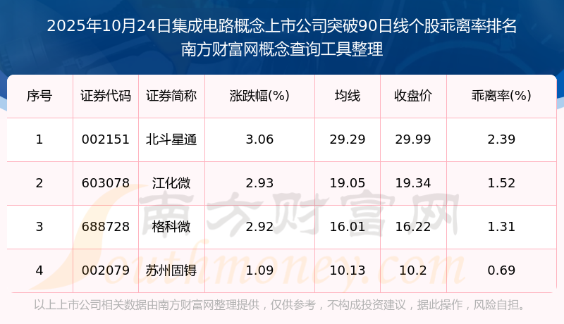 根據(jù)南方財富網(wǎng)概念查詢工具數(shù)據(jù)統(tǒng)計,截止2025年10月24日收盤,集成電路概念上市公司共有4只個股收盤價向上突破了90日線。其中乖離率較大的個股有北斗星通、江化微、格科微等,乖離率分別為2.39%、1.52%、1.31%。