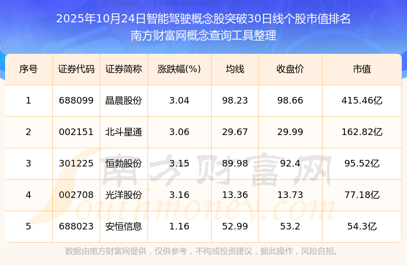 根據(jù)南方財富網(wǎng)概念查詢工具數(shù)據(jù)統(tǒng)計,截止2025年10月24日收盤,智能駕駛概念股共有5只個股收盤價向上突破了30日線。其中市值較大的個股有晶晨股份、北斗星通、恒勃股份等,市值分別為415.46億、162.82億、95.52億。