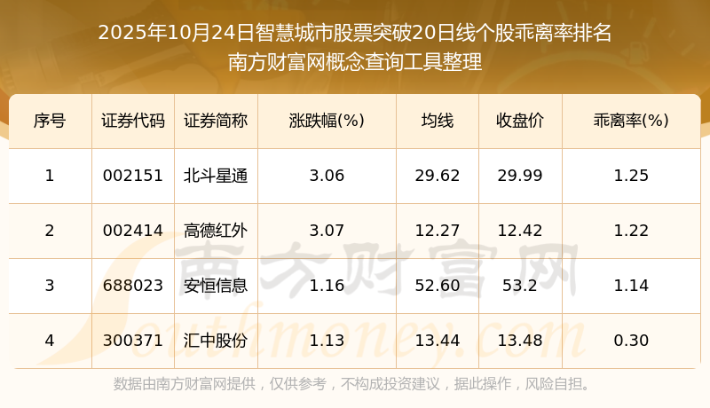 2025年10月24日智慧城市股票突破20日線個股乖離率排名