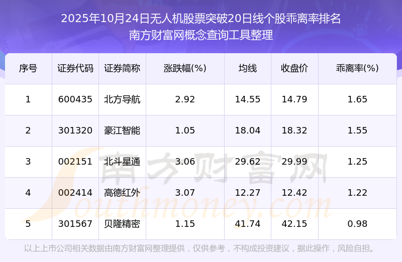 2025年10月24日無(wú)人機(jī)股票突破20日線個(gè)股乖離率排名