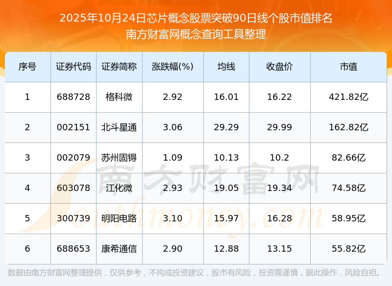 根據(jù)南方財(cái)富網(wǎng)概念查詢工具數(shù)據(jù)統(tǒng)計(jì),截止2025年10月24日收盤(pán),芯片概念股票共有6只個(gè)股收盤(pán)價(jià)向上突破了90日線。其中市值較大的個(gè)股有格科微、北斗星通、蘇州固锝等,市值分別為421.82億、162.82億、82.66億。