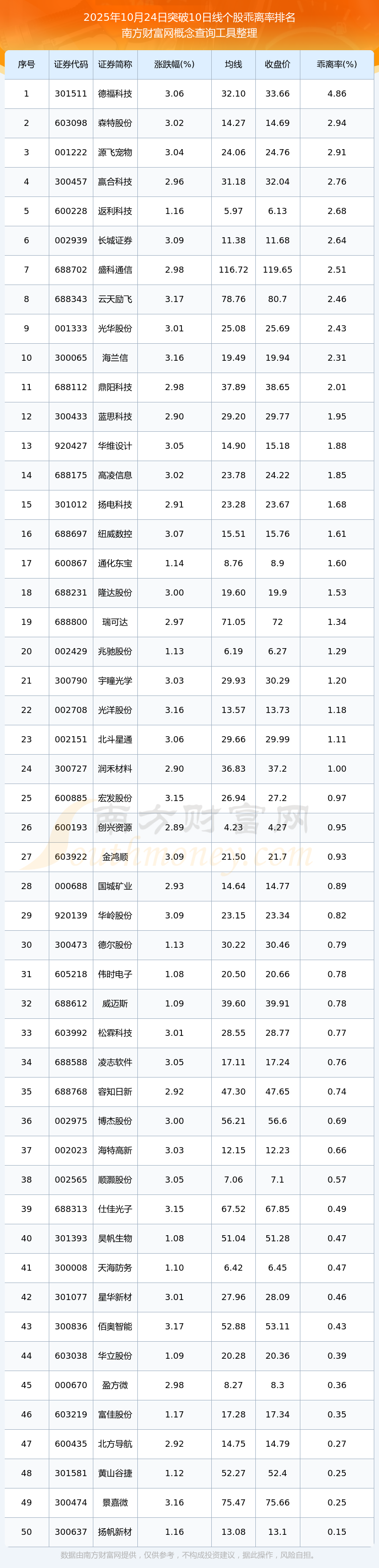 根據南方財富網概念查詢工具數據統(tǒng)計,截止2025年10月24日收盤,共有55只個股收盤價向上突破了10日線,其中乖離率較大的個股有德?萍、森特股份、源飛寵物、贏合科技、返利科技等,乖離率分別為4.86%、2.94%、2.91%、2.76%、2.68%。