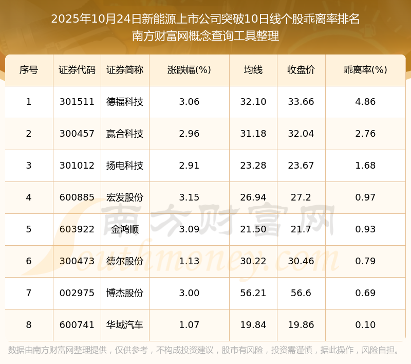 根據(jù)南方財(cái)富網(wǎng)概念查詢工具數(shù)據(jù)統(tǒng)計(jì),截止2025年10月24日收盤,新能源上市公司共有8只個(gè)股收盤價(jià)向上突破了10日線。其中乖離率較大的個(gè)股有德?萍肌②A合科技、揚(yáng)電科技等,乖離率分別為4.86%、2.76%、1.68%。