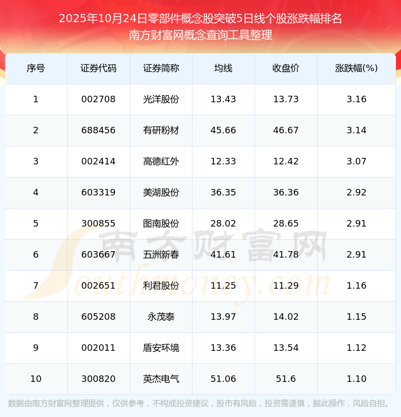 根據(jù)南方財富網(wǎng)概念查詢工具數(shù)據(jù)統(tǒng)計(jì),截止2025年10月24日收盤,零部件概念股共有10只個股收盤價向上突破了5日線。其中漲幅較大的個股有光洋股份、有研粉材、高德紅外等,漲幅分別為3.16%、3.14%、3.07%。