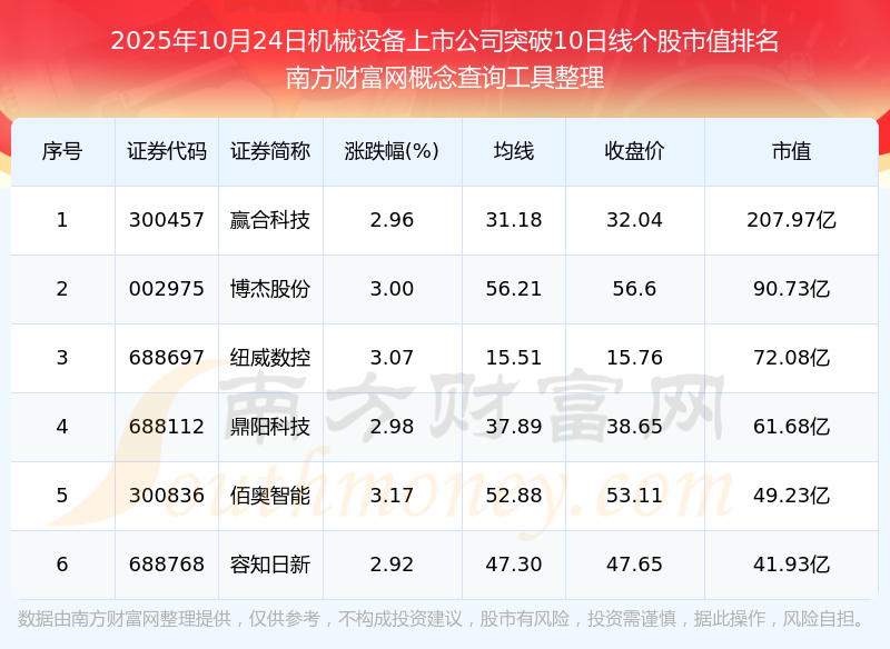 2025年10月24日機(jī)械設(shè)備上市公司突破10日線個(gè)股市值排名