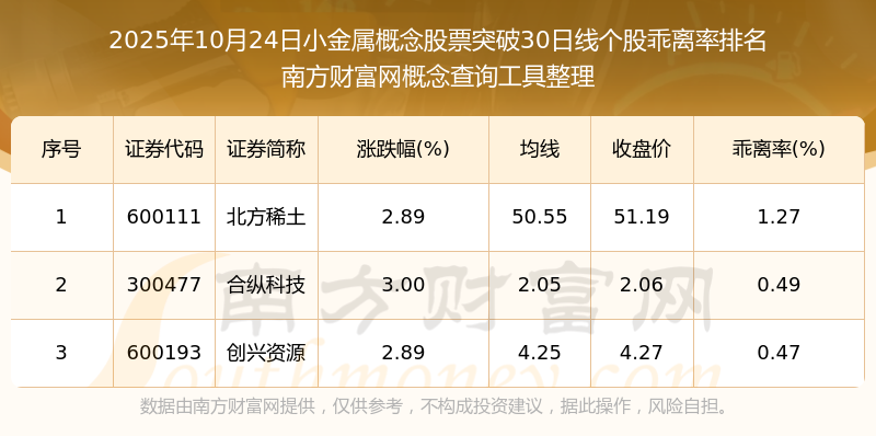 2025年10月24日小金屬概念股票突破30日線個股乖離率排名