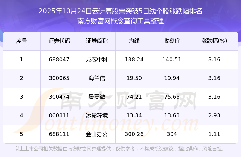 根據(jù)南方財富網(wǎng)概念查詢工具數(shù)據(jù)統(tǒng)計,截止2025年10月24日收盤,云計算股票共有5只個股收盤價向上突破了5日線。其中漲幅較大的個股有龍芯中科、海蘭信、景嘉微等,漲幅分別為3.16%、3.16%、3.16%。