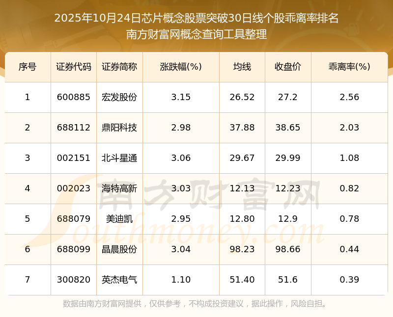 2025年10月24日芯片概念股票突破30日線個(gè)股乖離率排名
