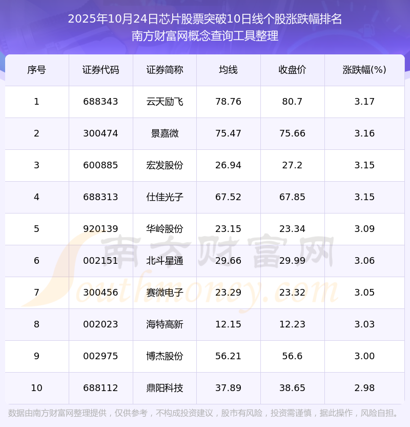 2025年10月24日芯片股票突破10日線個(gè)股漲跌幅排名