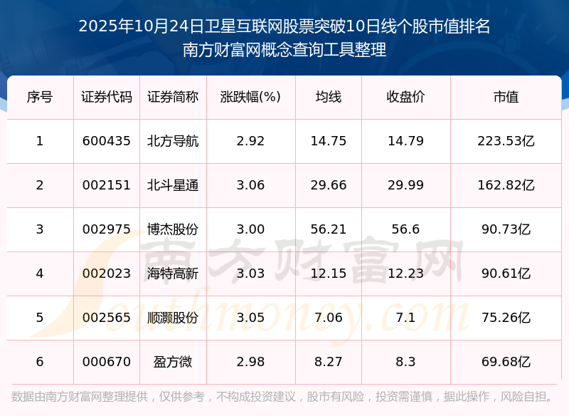 2025年10月24日衛(wèi)星互聯(lián)網(wǎng)股票突破10日線(xiàn)個(gè)股市值排名