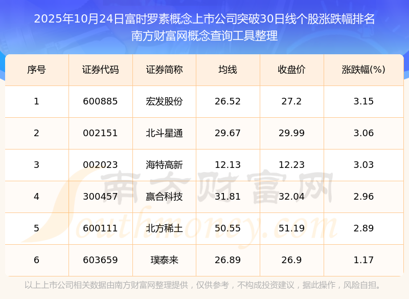 2025年10月24日富時羅素概念上市公司突破30日線個股漲跌幅排名