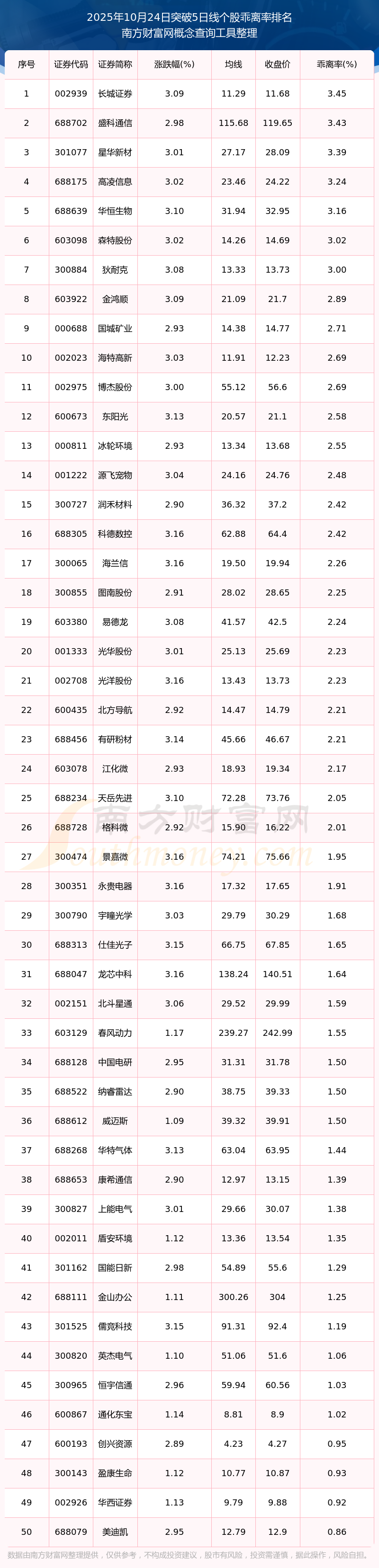 根據(jù)南方財富網(wǎng)概念查詢工具數(shù)據(jù)統(tǒng)計,截止2025年10月24日收盤,共有69只個股收盤價向上突破了5日線,其中乖離率較大的個股有長城證券、盛科通信、星華新材、高凌信息、華恒生物等,乖離率分別為3.45%、3.43%、3.39%、3.24%、3.16%。