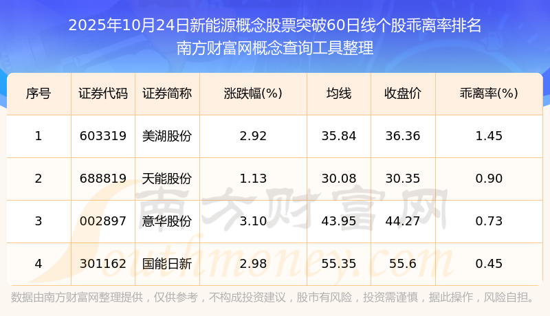 根據(jù)南方財富網(wǎng)概念查詢工具數(shù)據(jù)統(tǒng)計,截止2025年10月24日收盤,新能源概念股票共有4只個股收盤價向上突破了60日線。其中乖離率較大的個股有美湖股份、天能股份、意華股份等,乖離率分別為1.45%、0.90%、0.73%。
