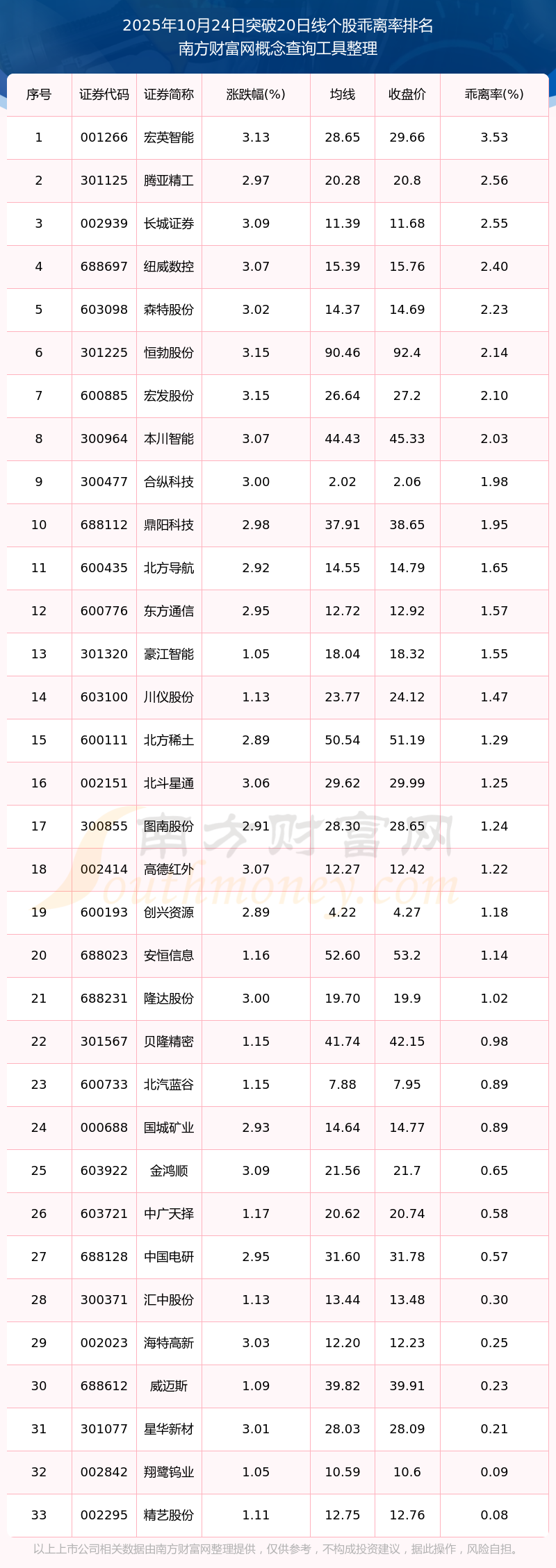 根據(jù)南方財富網(wǎng)概念查詢工具數(shù)據(jù)統(tǒng)計,截止2025年10月24日收盤,共有33只個股收盤價向上突破了20日線,其中乖離率較大的個股有宏英智能、騰亞精工、長城證券、紐威數(shù)控、森特股份等,乖離率分別為3.53%、2.56%、2.55%、2.40%、2.23%。