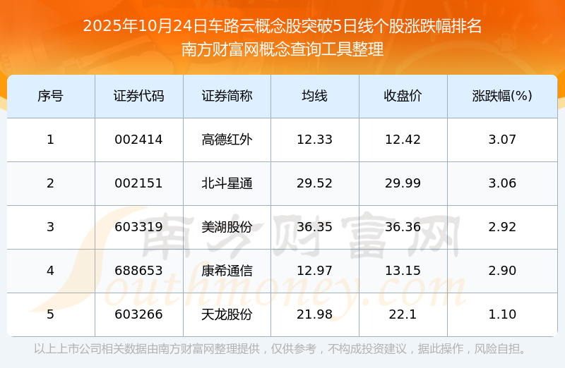 2025年10月24日車(chē)路云概念股突破5日線個(gè)股漲跌幅排名
