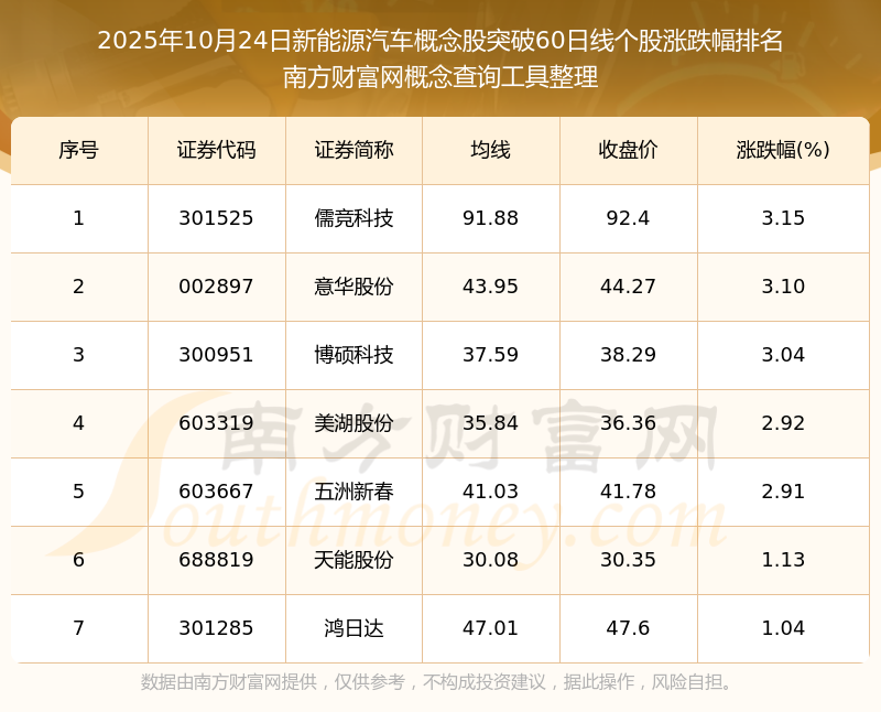根據(jù)南方財富網(wǎng)概念查詢工具數(shù)據(jù)統(tǒng)計,截止2025年10月24日收盤,新能源汽車概念股共有7只個股收盤價向上突破了60日線。其中漲幅較大的個股有儒競科技、意華股份、博碩科技等,漲幅分別為3.15%、3.10%、3.04%。