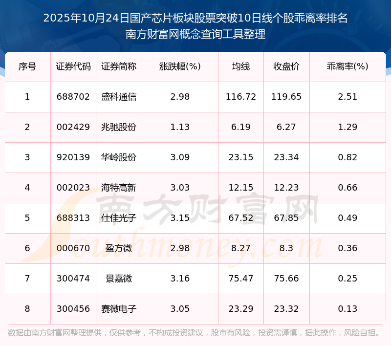 2025年10月24日國產(chǎn)芯片板塊股票突破10日線個(gè)股乖離率排名
