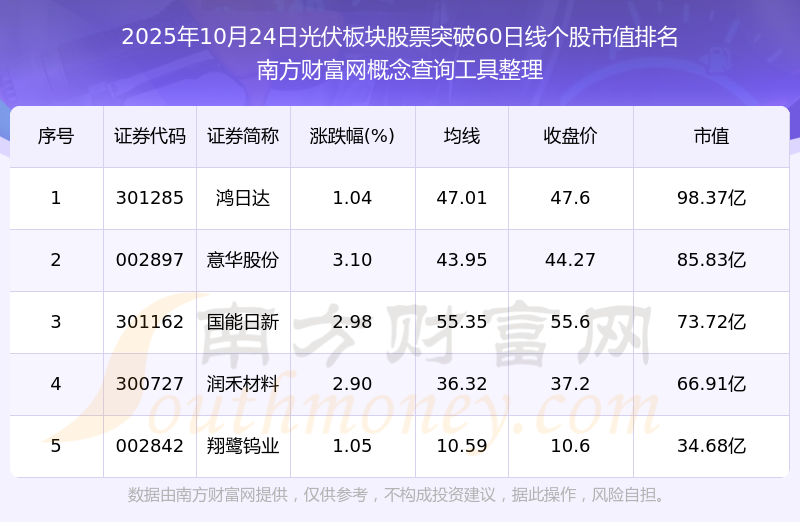 2025年10月24日光伏板塊股票突破60日線個股市值排名