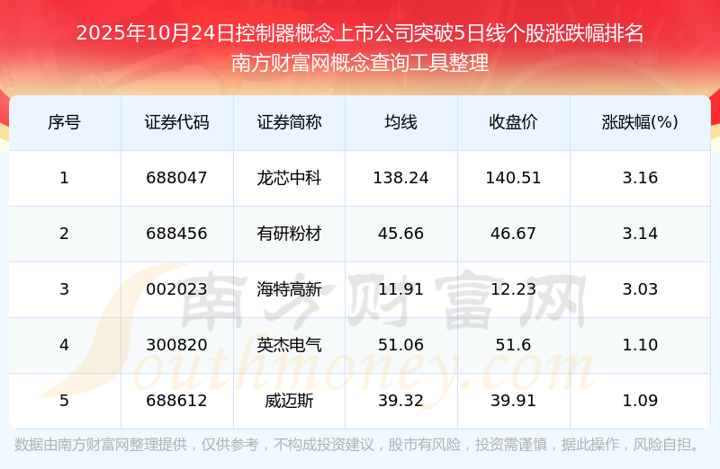 2025年10月24日控制器概念上市公司突破5日線(xiàn)個(gè)股漲跌幅排名