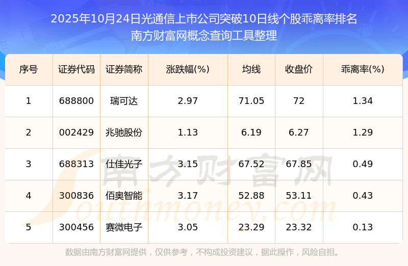 2025年10月24日光通信上市公司突破10日線個(gè)股乖離率排名