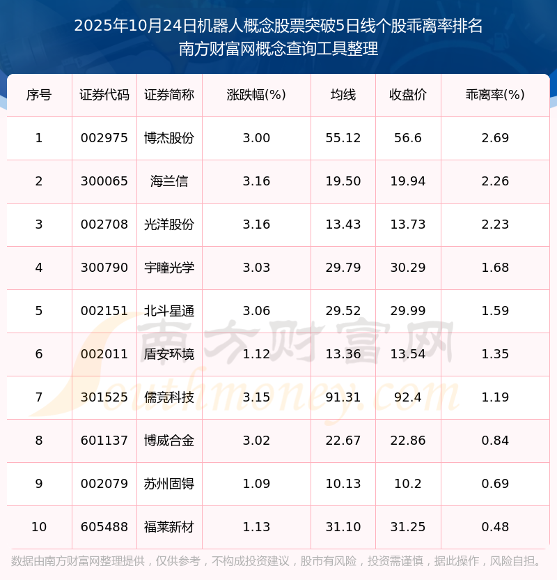 2025年10月24日機(jī)器人概念股票突破5日線個(gè)股乖離率排名