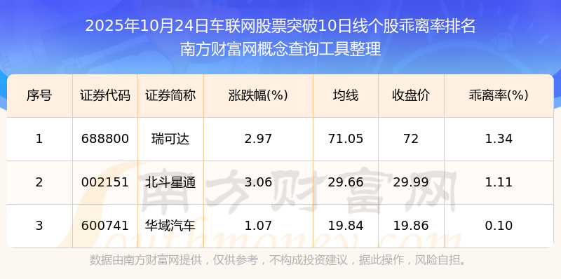 2025年10月24日車聯(lián)網(wǎng)股票突破10日線個股乖離率排名